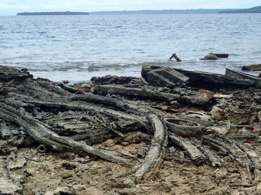 rusting metal beams for hundreds of metres along the shore