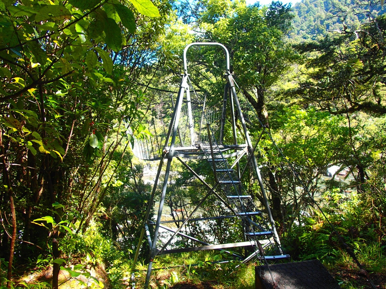 … over the smallest little swing bridge I have seen in New Zealand so far …